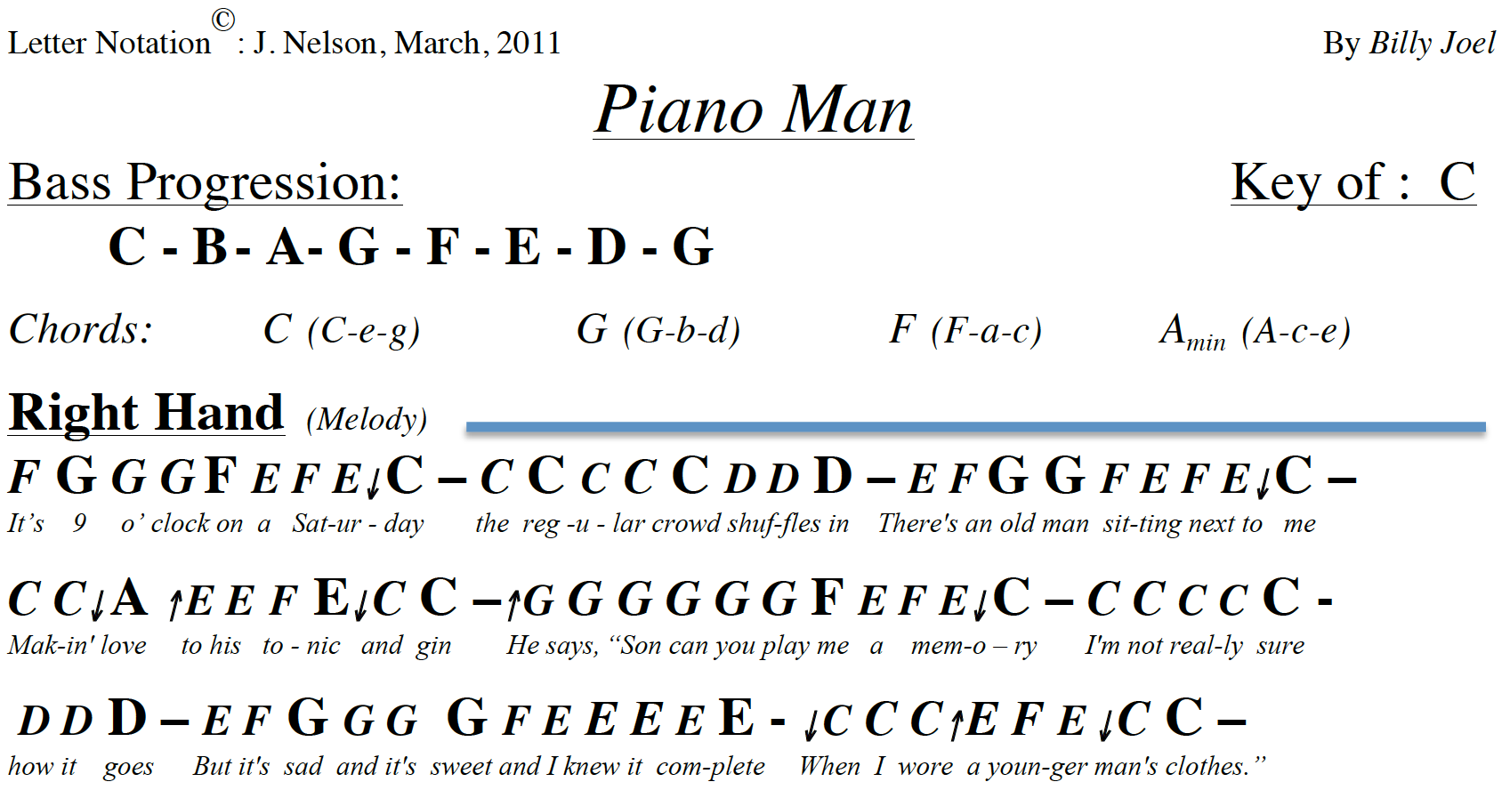 Share, download and print free sheet music for piano, guitar, flute and more with the world's largest community of sheet music creators, composers, performers, music teachers, students, beginners, artists and other musicians with over 1,000,000 sheet digital music to play, practice, learn and enjoy. There's an old man sitting next to me Making love to his tonic and gin He says, "Son, can you play me a memory?. Piano Man by Billy Joel text guitar tab One accurate version da C/E G7/D C Em/B Am C/G F C/E D7 Sing us a song your the piano man Sing us a song tonite G C Em/B Am C/G F G11 C Well were all in the mood for a melody and youve got us feeling all right F/C Cmaj7 {1,2,3,4 G11} Now Paul at the bar hes a freind of mine, he gets me my drinks for.