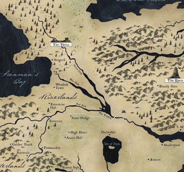 The early Game Of Thrones seasons spend a lot of time here, including Riverrun, The Twins, Harrenhal, and the Bloody Gate As the center of the continent, it's an area long under dispute. 1 Iron From Ice;. 5 A Nest of Vipers;.